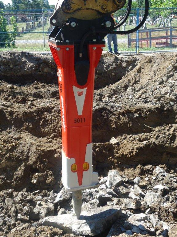 The Rammer 5011 is mounted on a Cat 345B hydraulic excavator and has already exceeded Corcoran’s expectations.“Once pressures and flows were adjusted we quickly noticed a 40 percent increase in productivity over our already effective G110. The 5011 does not stop going into the rock, even where the limestone is hardest,” Dan Corcoran concludes.“We are working in a trench application, so side scaling is inevitable, and the anti-blank feature is a life saver for the hammer and makes our operators more confident and productive. The stroke selector feature has not been used yet because all the rock so far has been very hard. But we look forward to the opportunity to switch and increase the speed of the hammer if the rock softens.”